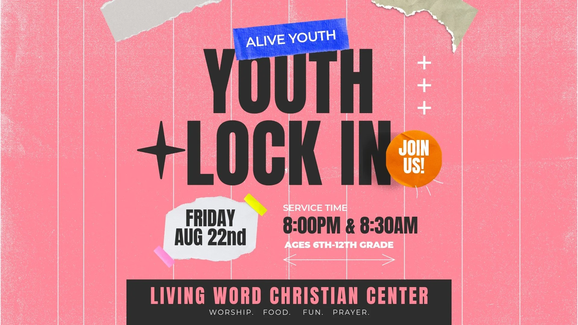 Alive youth lock in (6TH - 12TH GRADE) Friday, August 22, 2025 8:00 PM Saturday, August 23, 2025 8:30 AM Living Word Christian Center 13518 Biola Avenue La Mirada, CA, 90638 United States (map) Google Calendar ICS